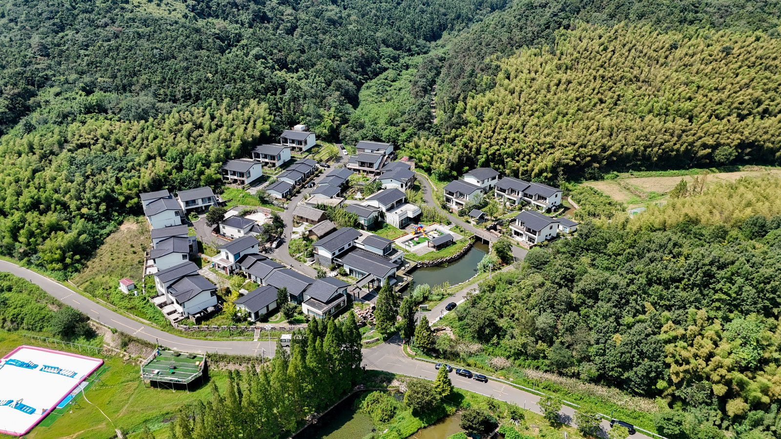 杉居酒店总占地约44亩,总建筑面积约9037㎡,于2018年11月开始建设,2023年11月对外运营。酒店前临大岘水库,背靠雷公尖山体,四周竹林、松林环绕,生态环境优越。建设过程中,利用原有大岘村庄改造建设,遵循原有村落肌理进行规划布局,避免对原有山林、水体的破坏,保持原生态开发建设,同时完善村内水电综合管网、污水处理等功能设施,减少建成后运营对生态环境的影响。现配备经营客房95间,共计床位数145个,可满足各个年龄段入住人群需求。酒店内设置多功能餐厅、包间、特色小吃区,可同时供100多位游客同时就餐,满足各类游客的饮食需求。此外,酒店内还设置娱乐空间、健身空间、购物空间、康养空间、休闲空间等功能区,通过分不同主题的片区,提升空间体验感,增加空间丰富性,以一条主环路串连所有主题片区,供游客分时分片浏览景区。目前,该酒店已长期承接旅居康养、辟谷养生团队。